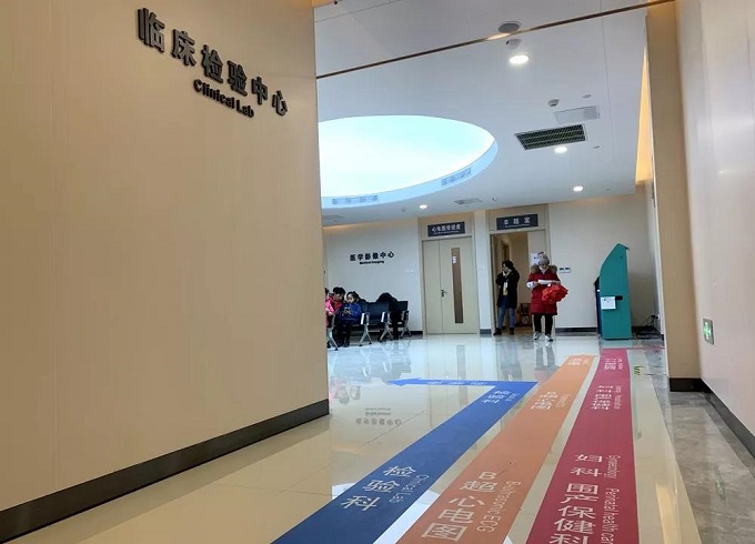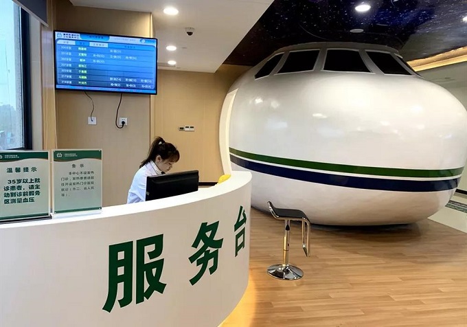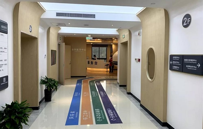 整个大楼以健康航班为主线,各航站有不同主题,设有“引导区、自测区、便民区、特护区、母婴区、候诊区、体验区、宣教区”等八个功能区域,并用不同颜色指引带标注,配备相应便民用品。