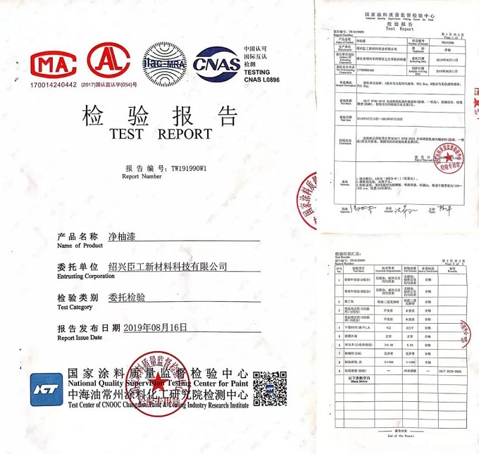 物理性能检测报告是在国家涂料质量监督检验中心完成的,实验结果显示净柚涂层具有高达6H的硬度、可擦洗数达60000次以上,且干燥时间快、抗碱性能优异。