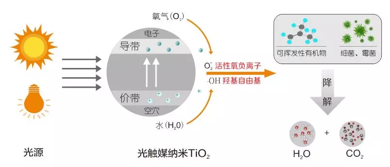 光触媒是一种纳米级的金属氧化物材料(二氧化钛比较常用),在光的照射下,会产生类似光合作用的光催化反应,产生出氧化能力极强的自由氢氧基和活性氧,具有很强的光氧化还原功能,可氧化分解各种有机化合物和部分无机物,能破坏细菌的细胞膜和固化病毒的蛋白质,可杀灭细菌和分解有机污染物,把有机污染物分解成无污染的水(H2O)和二氧化碳(CO2),因而具有极强的杀菌、除臭、防霉、防污自洁、净化空气功能。